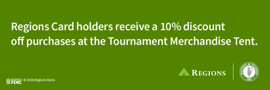 Stop by the Merchandise Shop in the Coca-Cola Pavilion! Items for sale include exclusive tournament caps, golf shirts, pin flags, golf balls, accessories, t-shirts and children’s apparel. The merchandise shop will open when the gates open and remain open until the end of play. Receive 10% off at checkout if purchasing with a Regions Card!