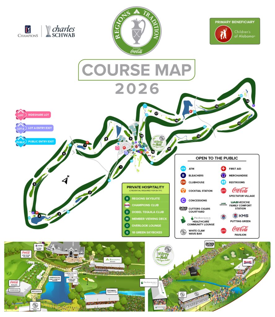 • The Coca-Cola Spectator Village is located behind the Driving Range. It includes the Coca-Cola Pavilion, UAB Medicine Family Comfort Station, Back Nine Golf Simulator, and the Merchandise Shop. All of these areas are open to the public. Golden Rule BBQ and drinks will be available for purchase.